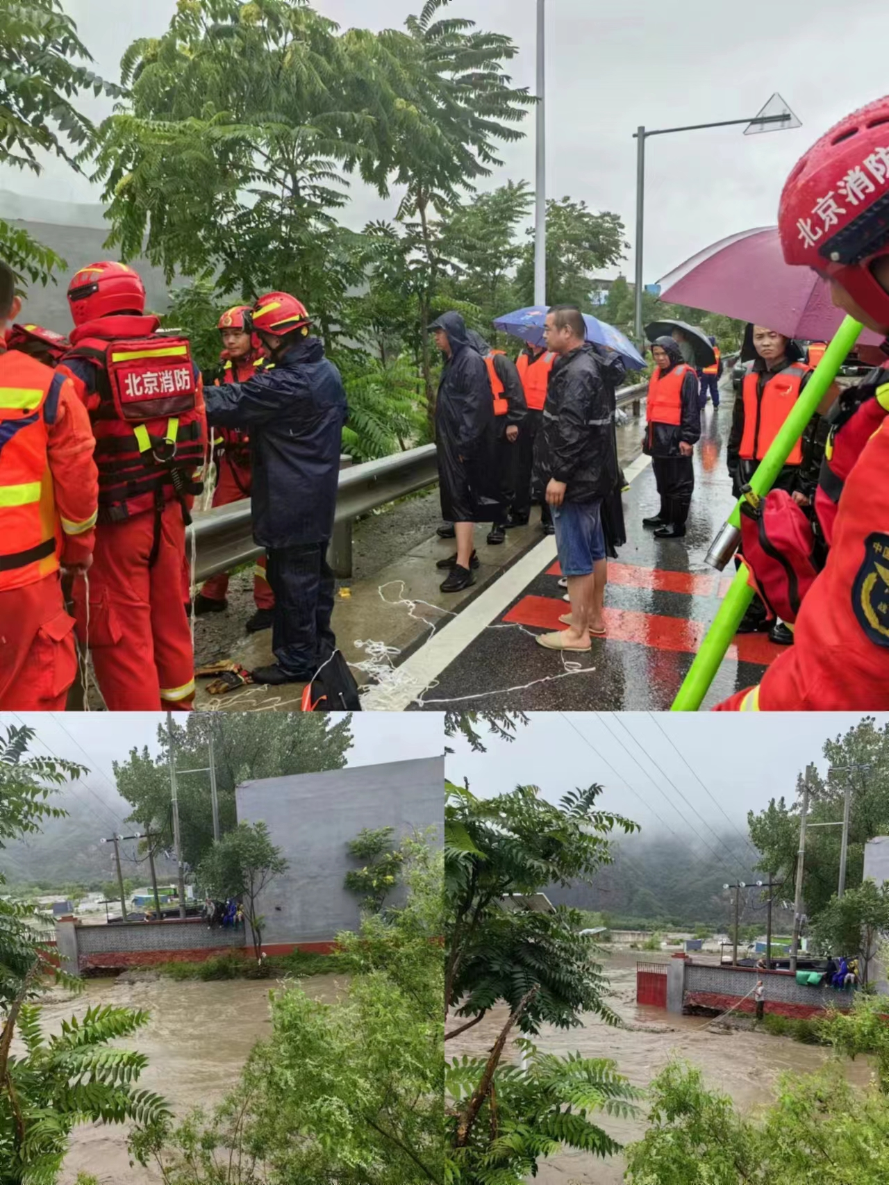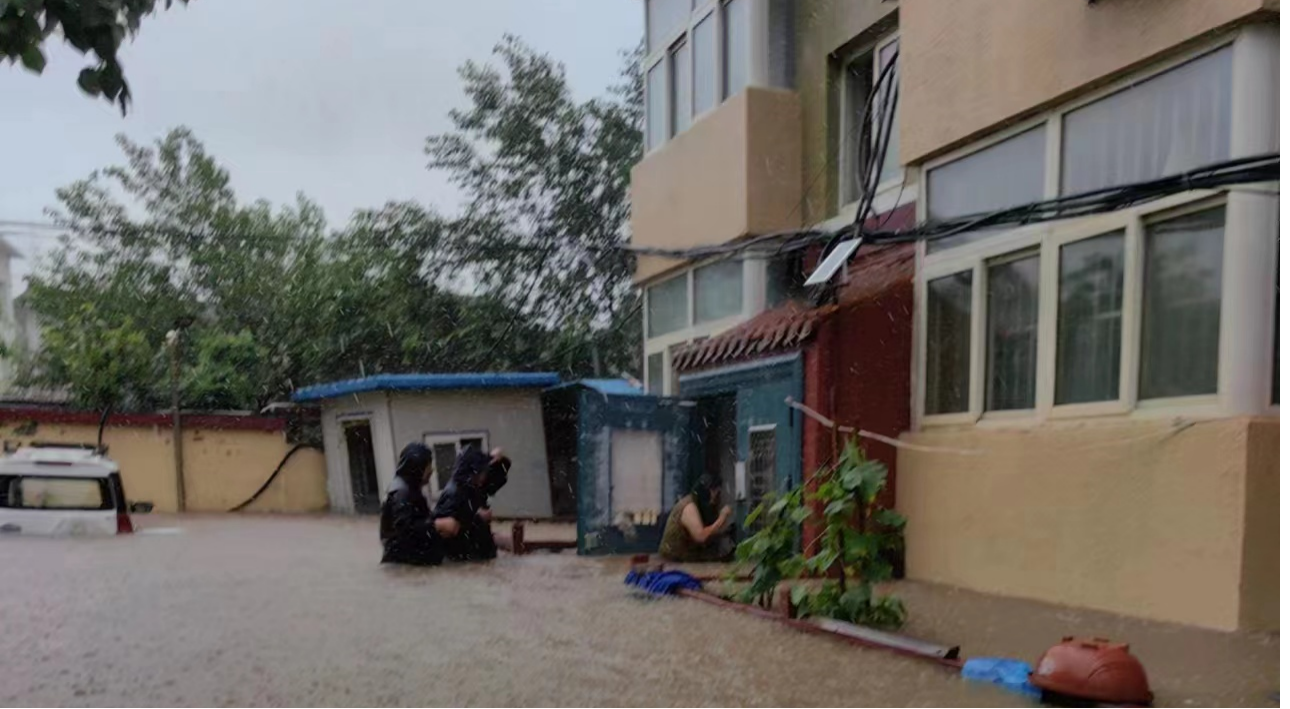 30日房山区青龙湖队于夜间排查时,发现路上的积水不断,并及时排查险情,31日时由于降雨集中,排水量达不到,水位已到达腰部。我们保安员查看情况并帮助群众。