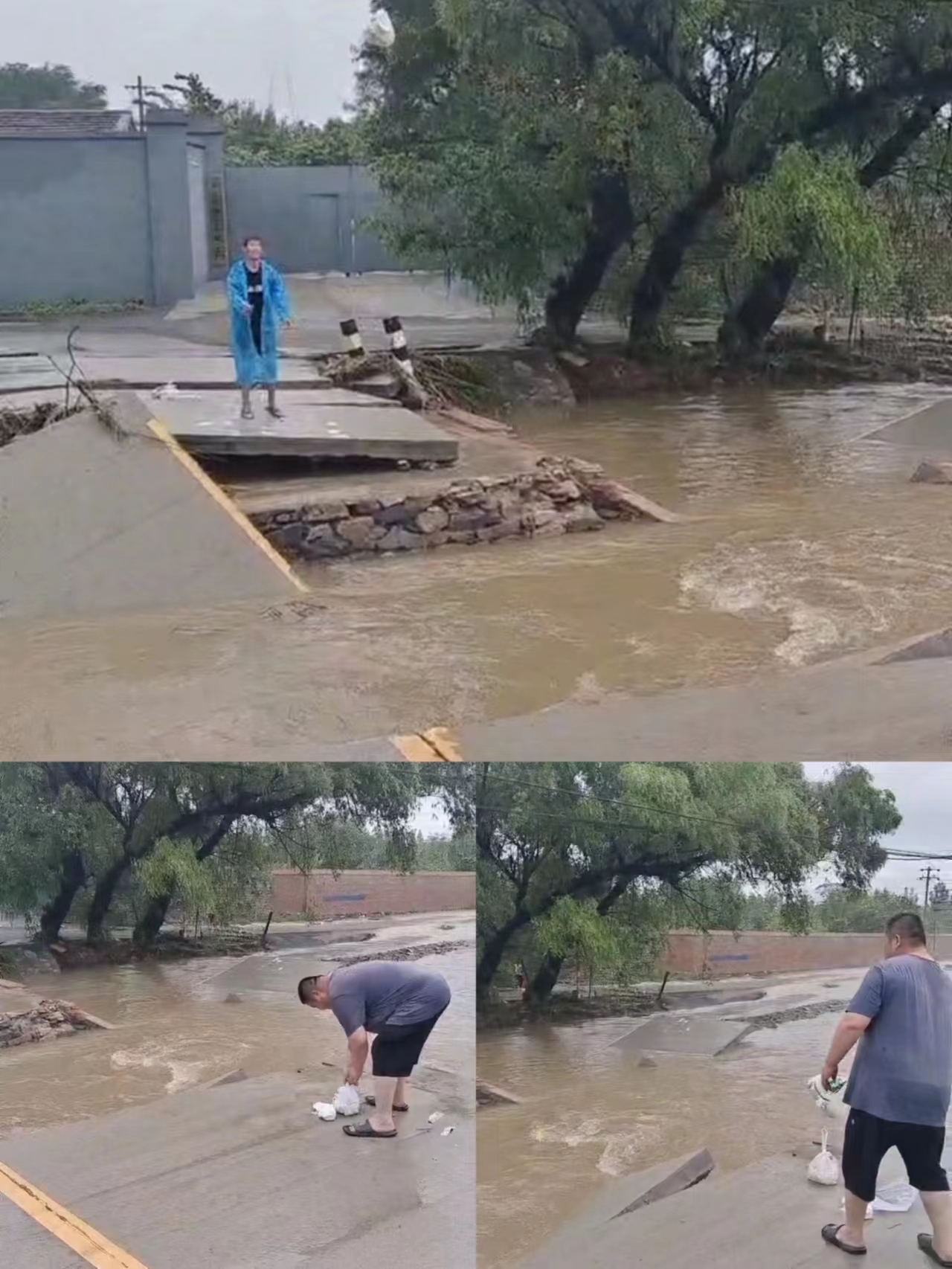 路面由于水量过大,已经发生塌陷,路对面的人过不来,没有办法吃饭,并且在车里呆了三天,我们保安员把饭菜装好,扔到路对面的人员手里,据了解保安队长三天时间仅睡了10个小时。